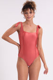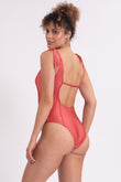 Maiô, com decote clássico na frente e atrás mais profundo, com tira fina na horizontal coberta nas costas, amarração no ombro, cobertura média, sem bojo.