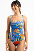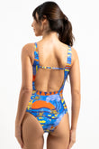 Maiô, medium coverage, decote clássico na frente e atrás mais profundo, com tira fina na horizontal removível nas costas, sem bojo.
