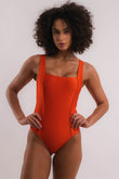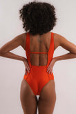 Maiô,  medium coverage, decote clássico na frente e atrás mais profundo, com tira fina na horizontal removível nas costas, sem bojo.