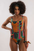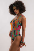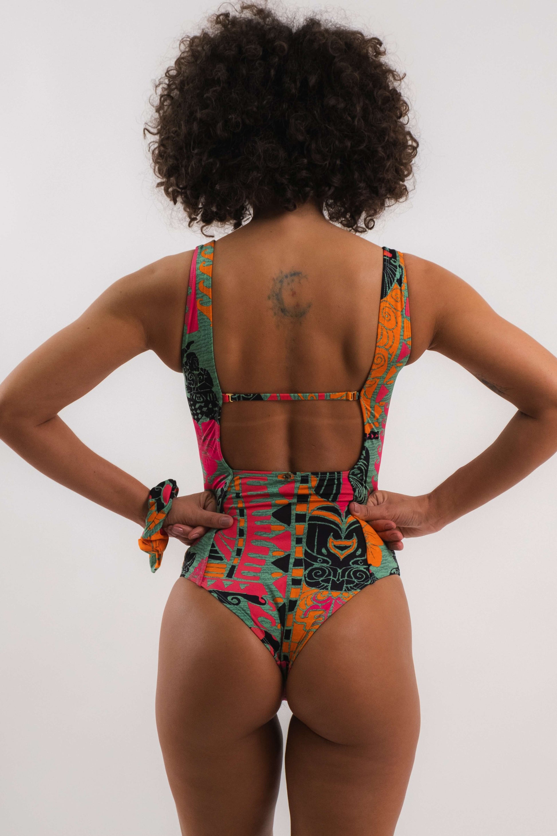 Maiô, medium coverage, decote clássico na frente e atrás mais profundo, com tira fina na horizontal removível nas costas, sem bojo.