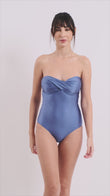 Maiô cobertura média, tomara que caia, bojo fixo, alçada competitiva, amarração atrás e decote nas costas.