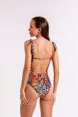 Maiô, com decote clássico na frente e atrás mais profundo, com tira fina na horizontal removível nas costas, amarração no ombro, medium coverage, sem bojo.