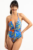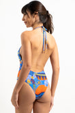 Maiô medium coverage, sem bojo, com detalhe de nó frontal na frente, e amarração no pescoço.