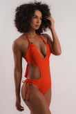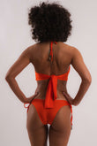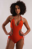 Maiô, medium coverage, decote na frente, argolas decorativas, amarração atrás e nas laterais, engana mamãe, sem bojo.