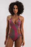 Maiô, medium coverage, decote na frente, argolas decorativas, amarração atrás e nas laterais, engana mamãe, sem bojo.