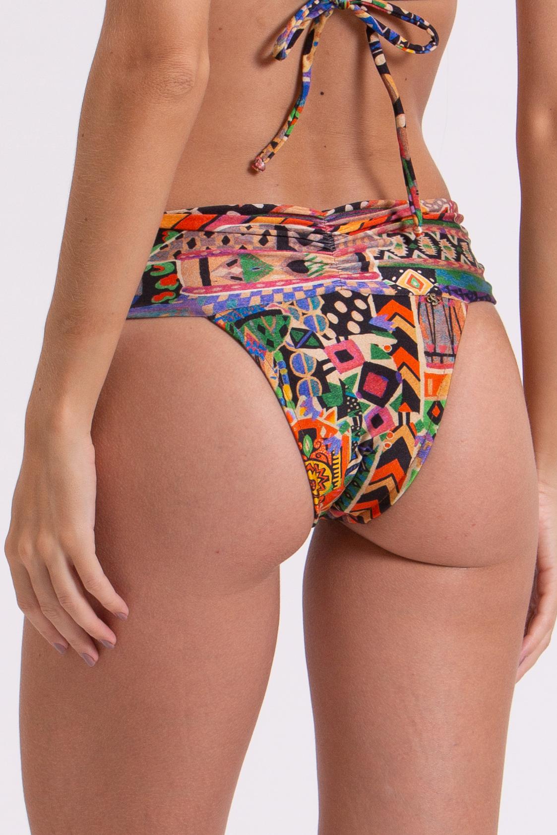 Cobertura média inferior, cós largo, com detalhe franzido nas laterais, frente e costas do cós.