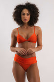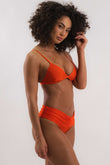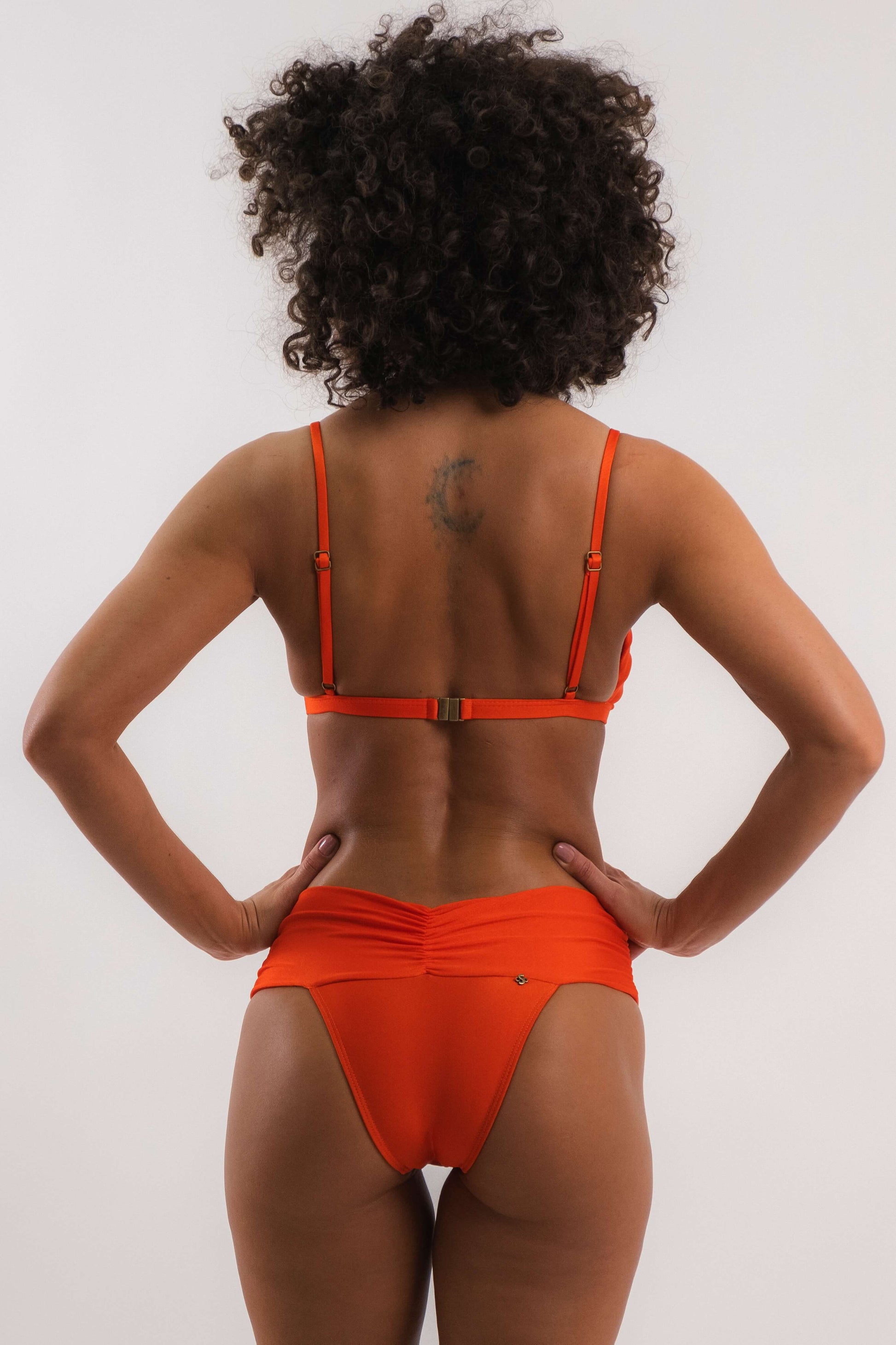 Bottom medium coverage, cós largo, com detalhe franzido nas laterias,frente e costas do cós.
