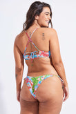 Top de baixa sustentação, com alças finas e cruzadas atrás, sem bojo.