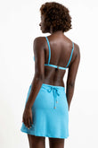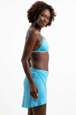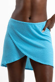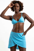 Saia tipo envelope com tira fixa para amarração na cintura.