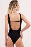 Maiô, cobertura média, decote clássico na frente e atrás mais profundo, com tira fina na horizontal exposta nas costas, sem bojo.