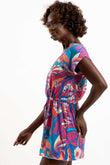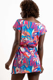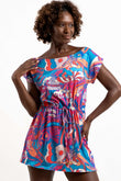 Vestido com canaleta ajustável na cintura, mangas curtas e gola canoa.