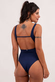 Maiô, cobertura média, decote clássico na frente e atrás mais profundo, com tira fina na horizontal exposta nas costas, sem bojo.
