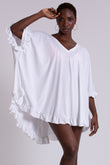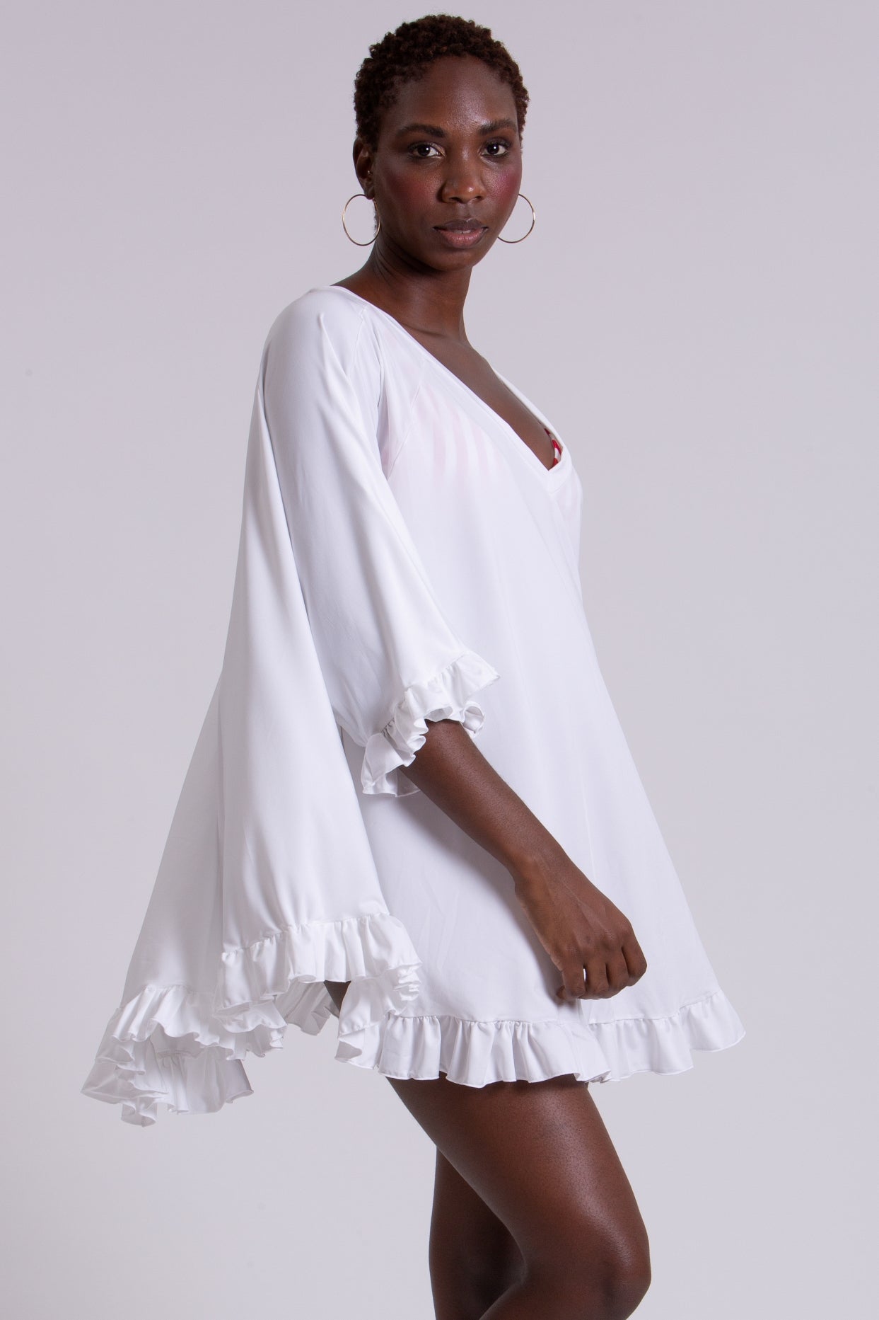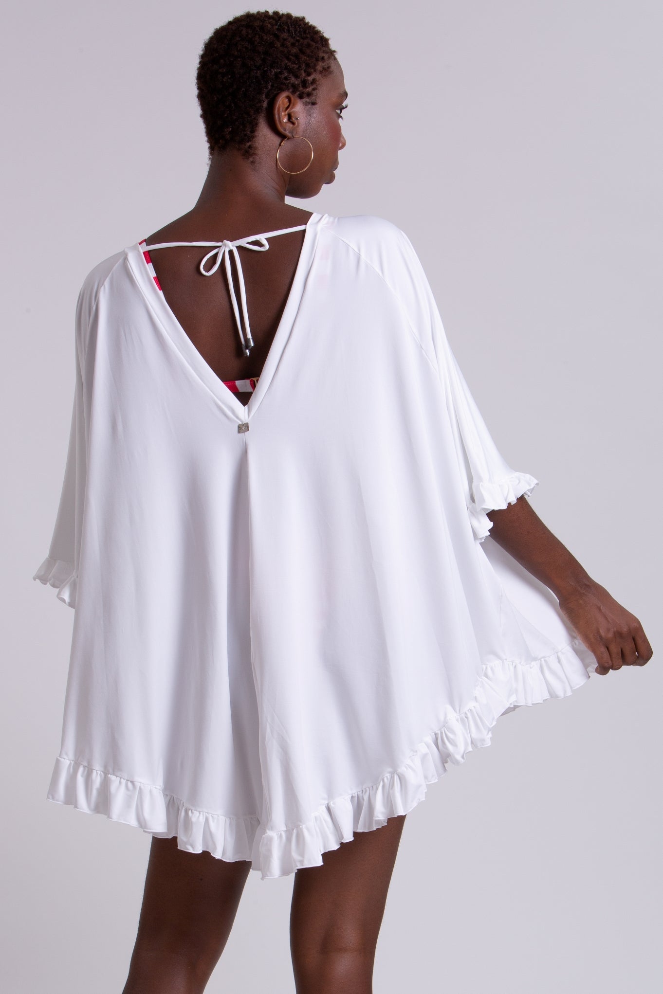 Bata decote em v , babado na manga e barra, detalhe de amarração atrás.
