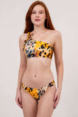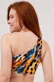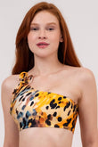 Top de alta sustentação, de um ombro só, com amarração no rolete, e ponteiras decorativas.